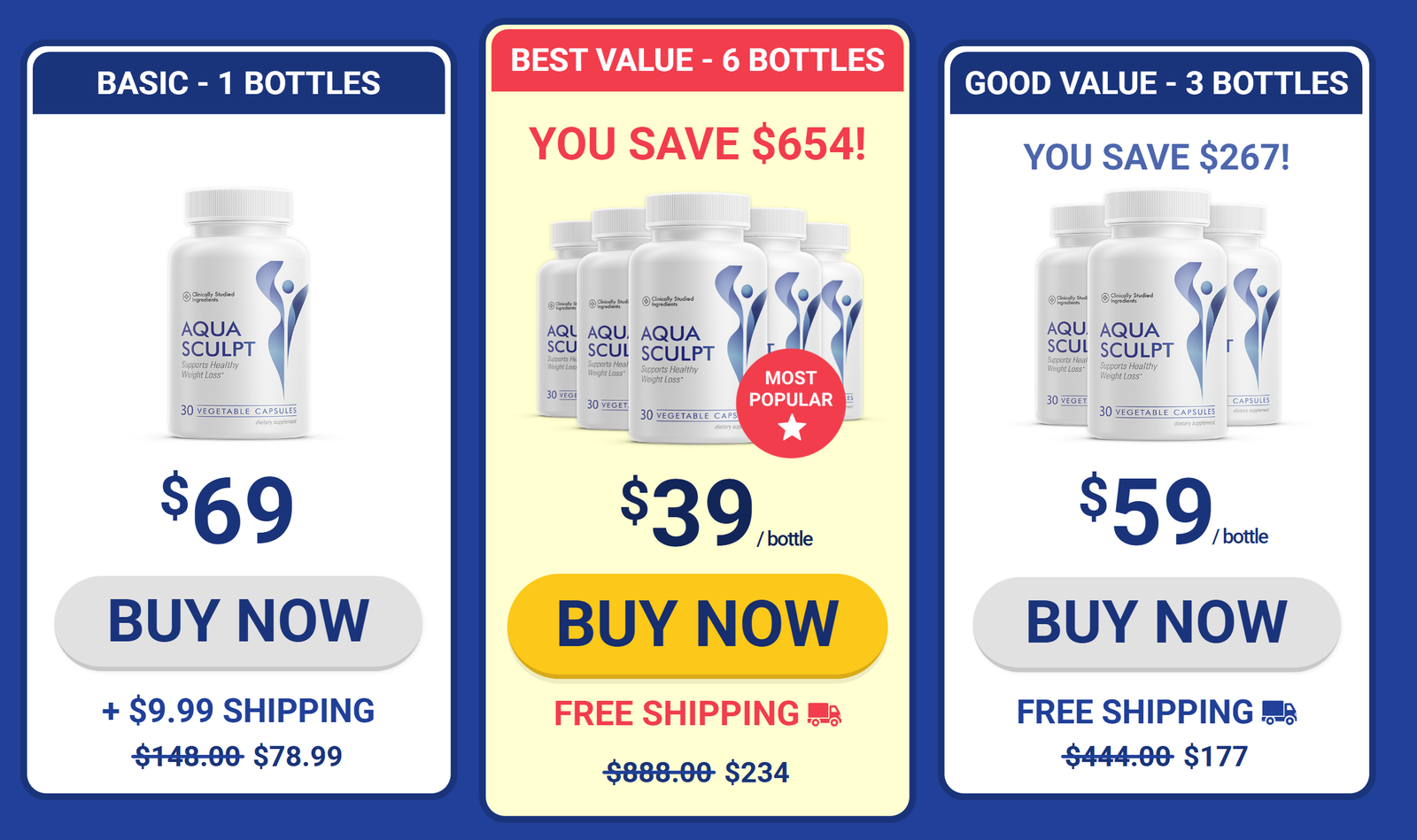Click on one of the package options, enter your order details on our secure checkout page, and we’ll ship your AquaSculpt to you right away. Remember, when you order our 6-bottle pack, you will also receive free shipping.
